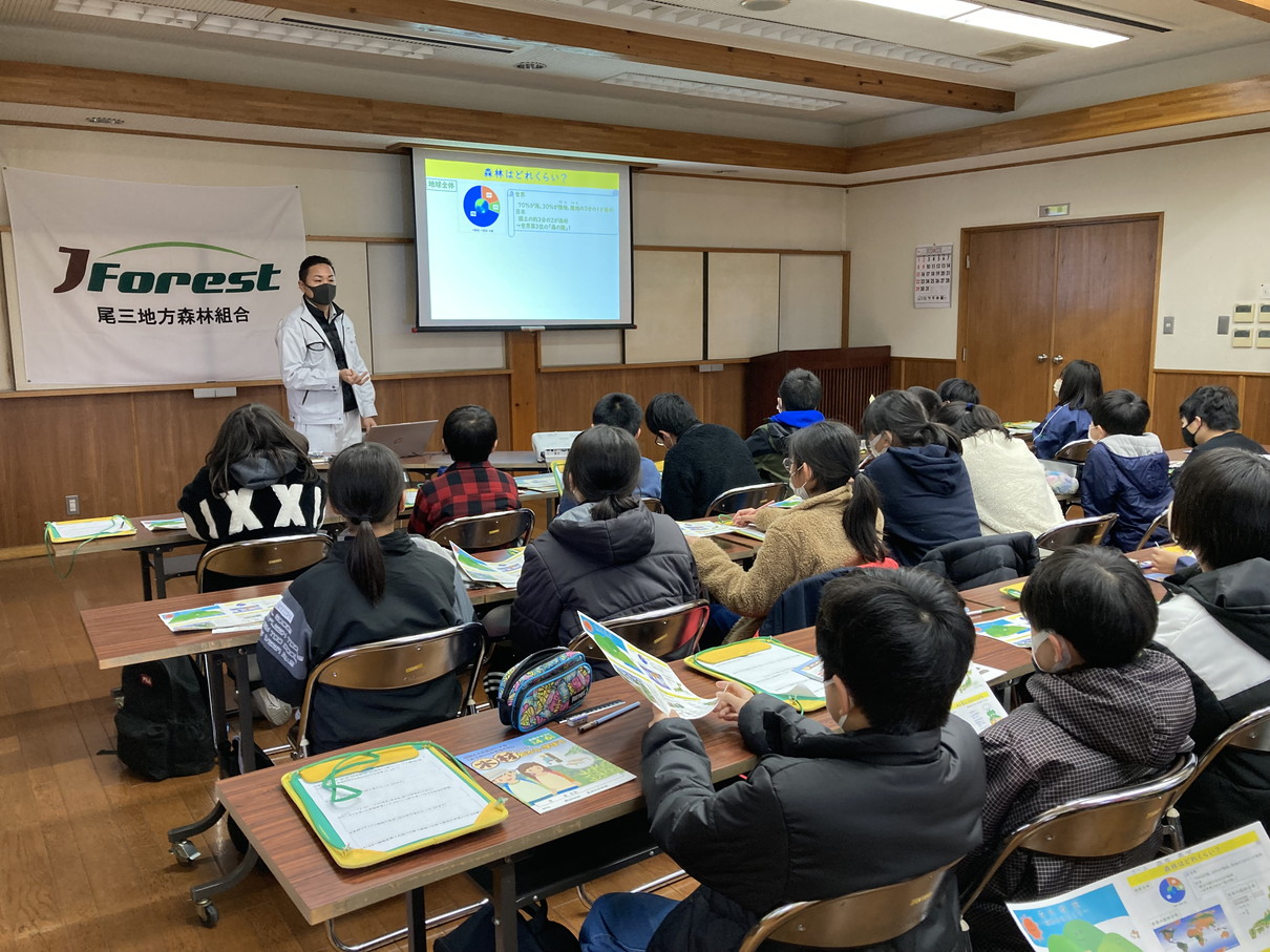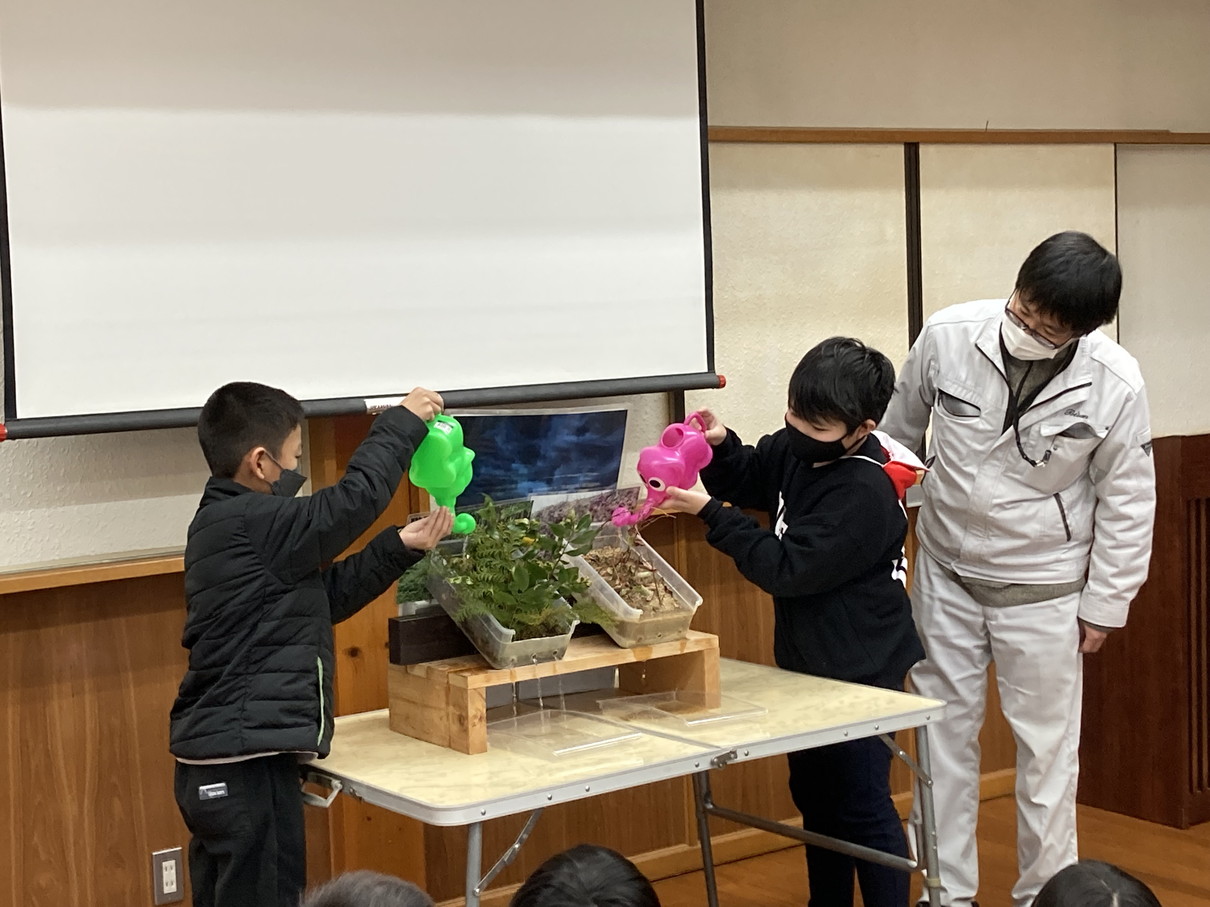 森林教室~水と森林のはたらき~について説明し、水をきれいにしたり土砂崩れを防いだりする森林の役割、木の大切さを学びました。