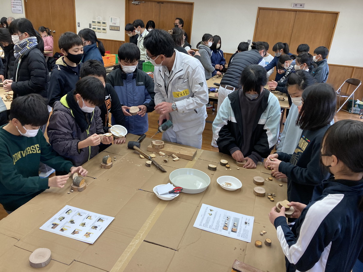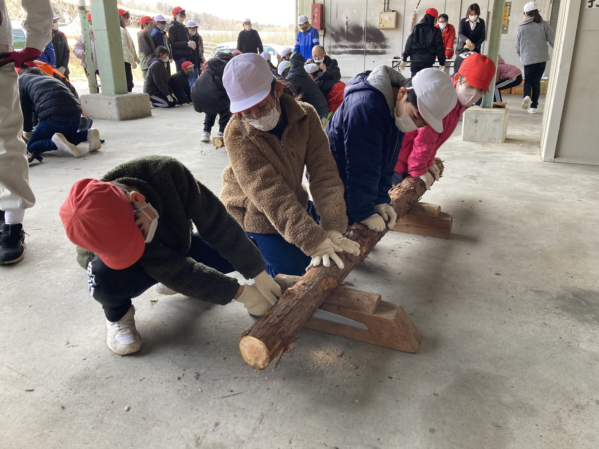 天然の木材に触れ合う木工クラフト、のこぎりを使って丸太を切り重さを当てるゲーム形式の体験活動も行いました。