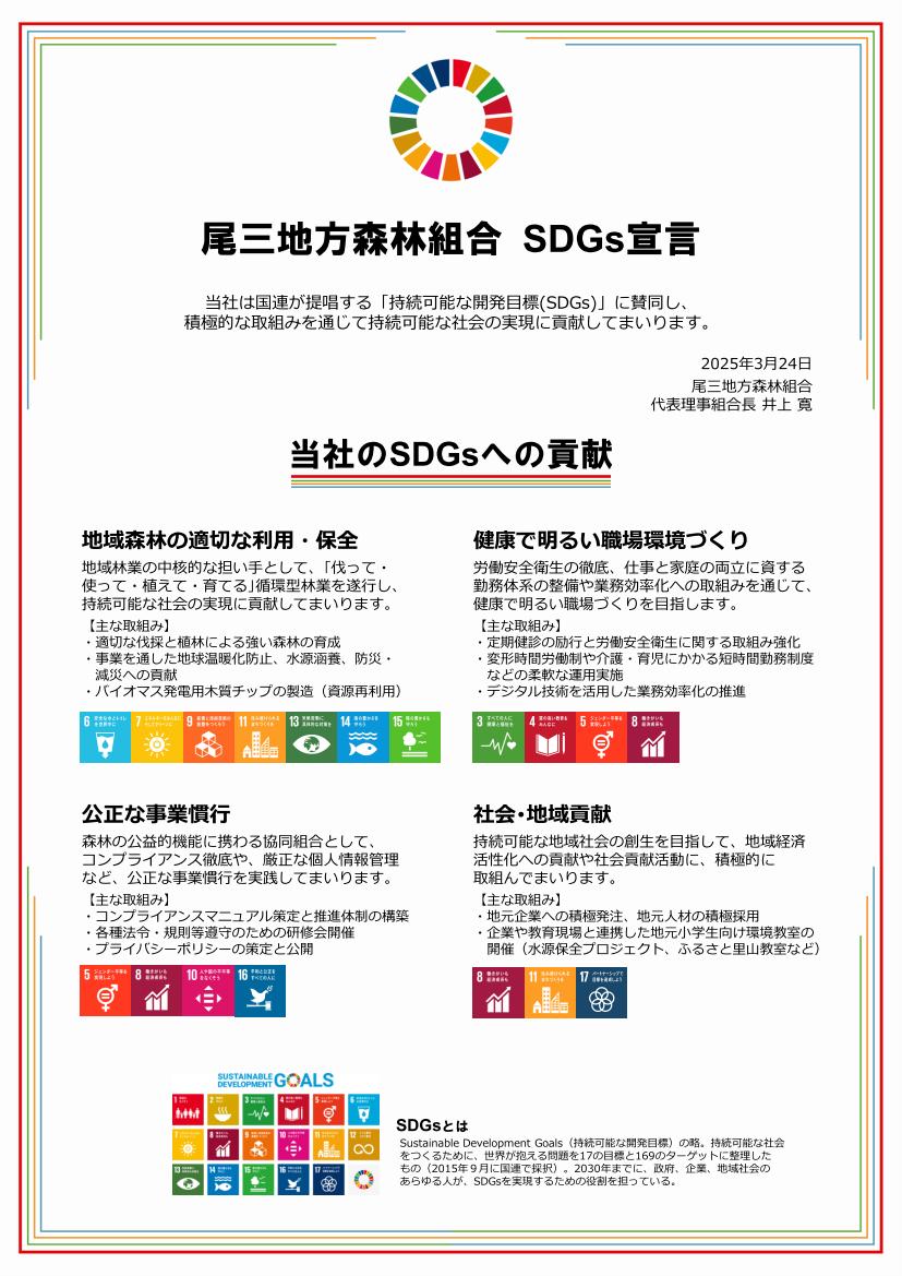 尾三地方森林組合は国連が提唱する「持続可能な開発目標(SDGs)」に賛同し、積極的な取組みを通じて持続可能な社会の実現に貢献してまいります。