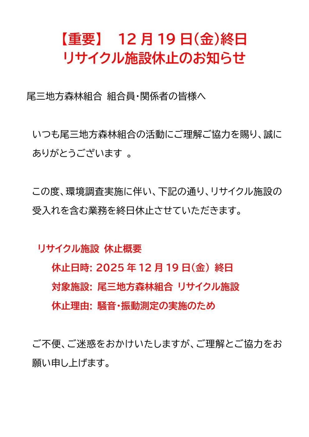 【重要】12月19日(金)終日リサイクル施設休止のお知らせ (2025-12-08)